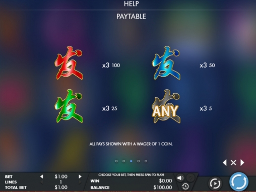 Выплаты начисляются в монетах текущего номинала. Выиграть можно пять, двадцать пять, пятьдесят или сто чипов.