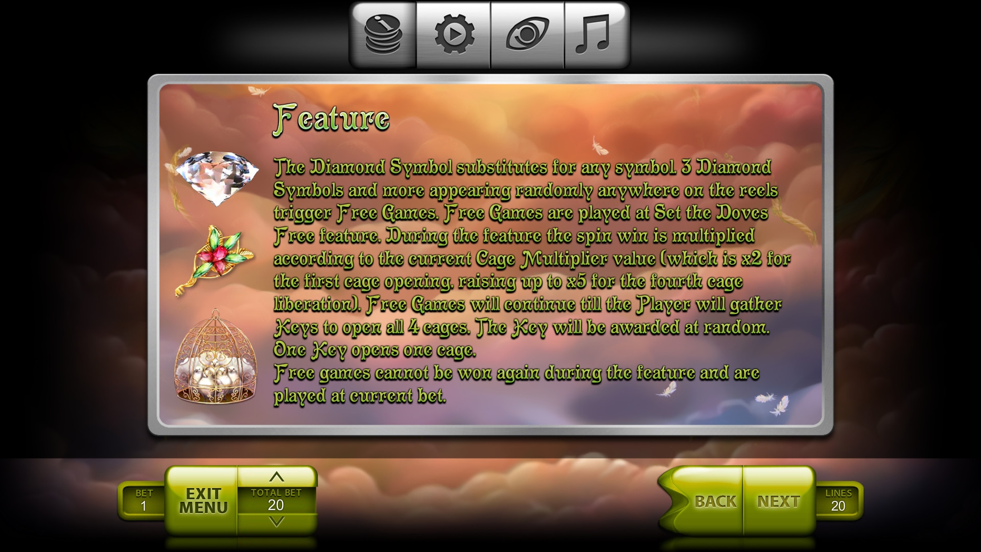 Есть режим автоигры, а также настройки звука, графики и экрана. В меню вы увидите таблицу выплат, схему линий и общие правила.
