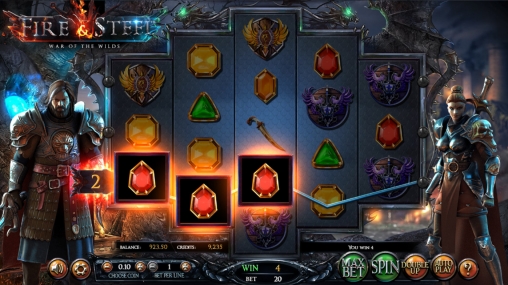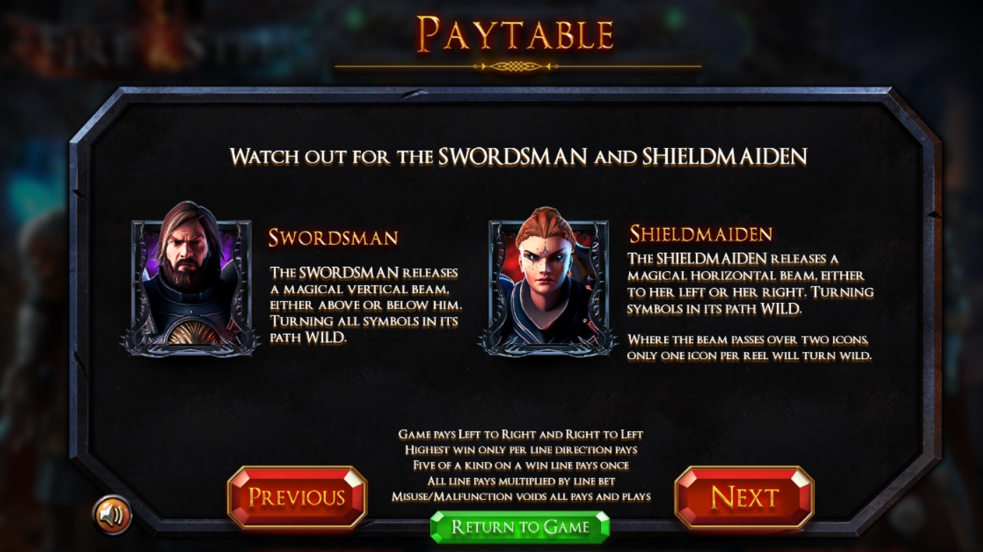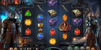 - Также в Fire and Steel используются три разновидности джокеров: надпись Wild, воин и его спутница. Они заменяют другие картинки в цепочках. Все джокеры могут сами формировать комбинации. Главные герои также задействованы в бонусных розыгрышах.