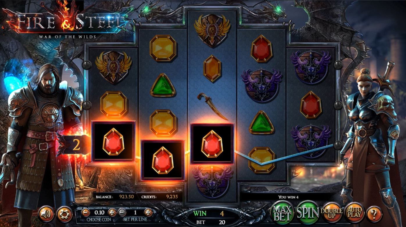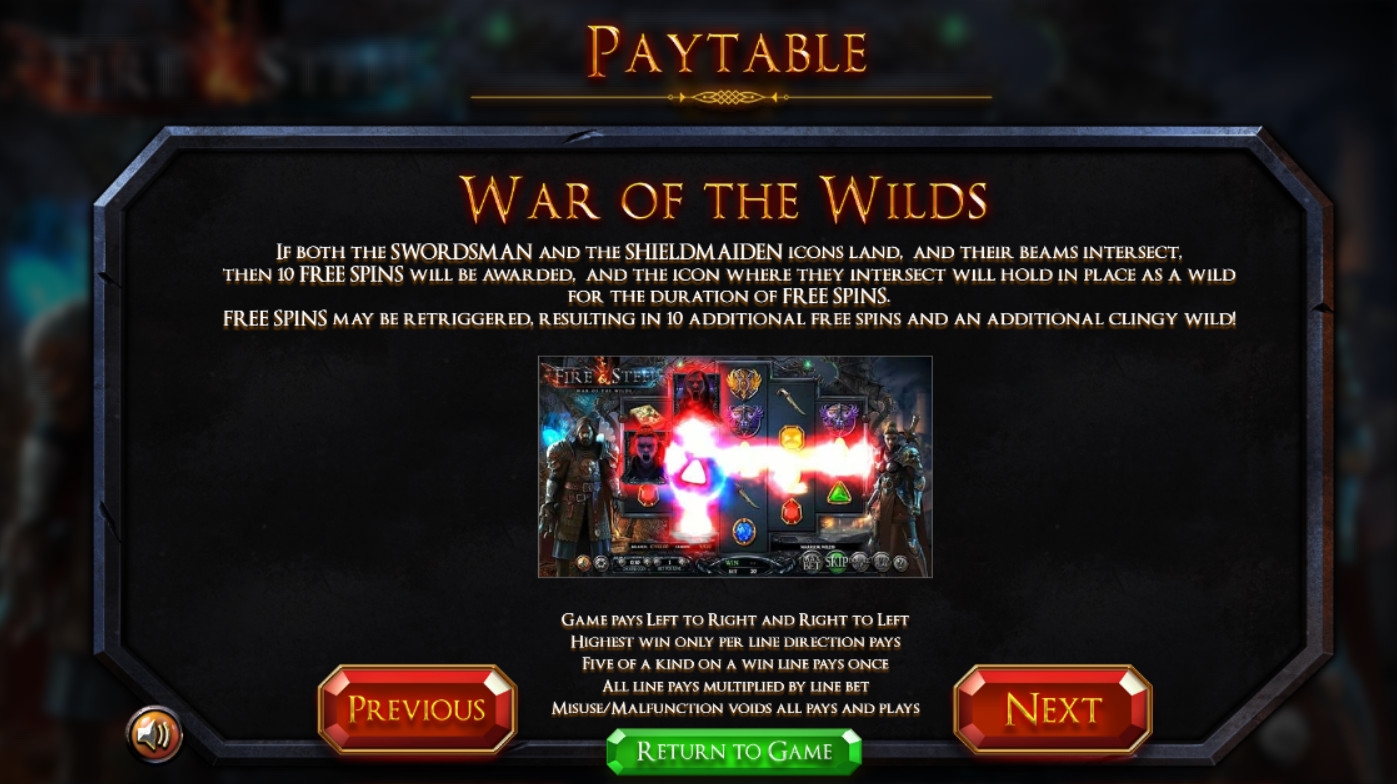 Игровой автомат Fire and Steel: War of the Wilds состоит из пяти барабанов. Они отличаются друг от друга размерами. В крайних колонках по три символа, во второй и четвертой – по четыре, а в средней – пять.