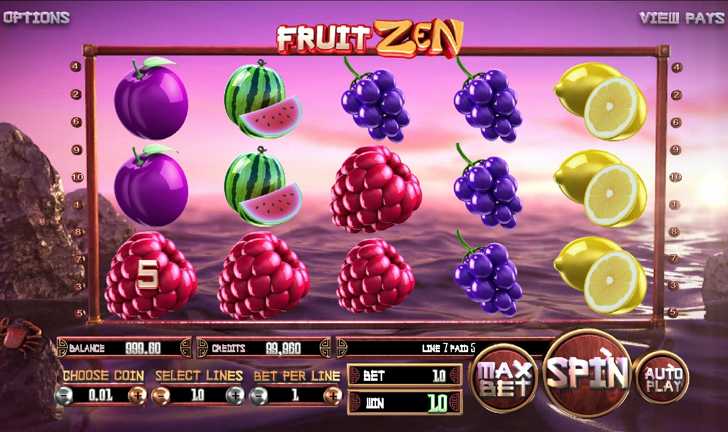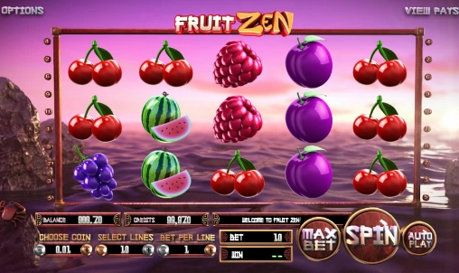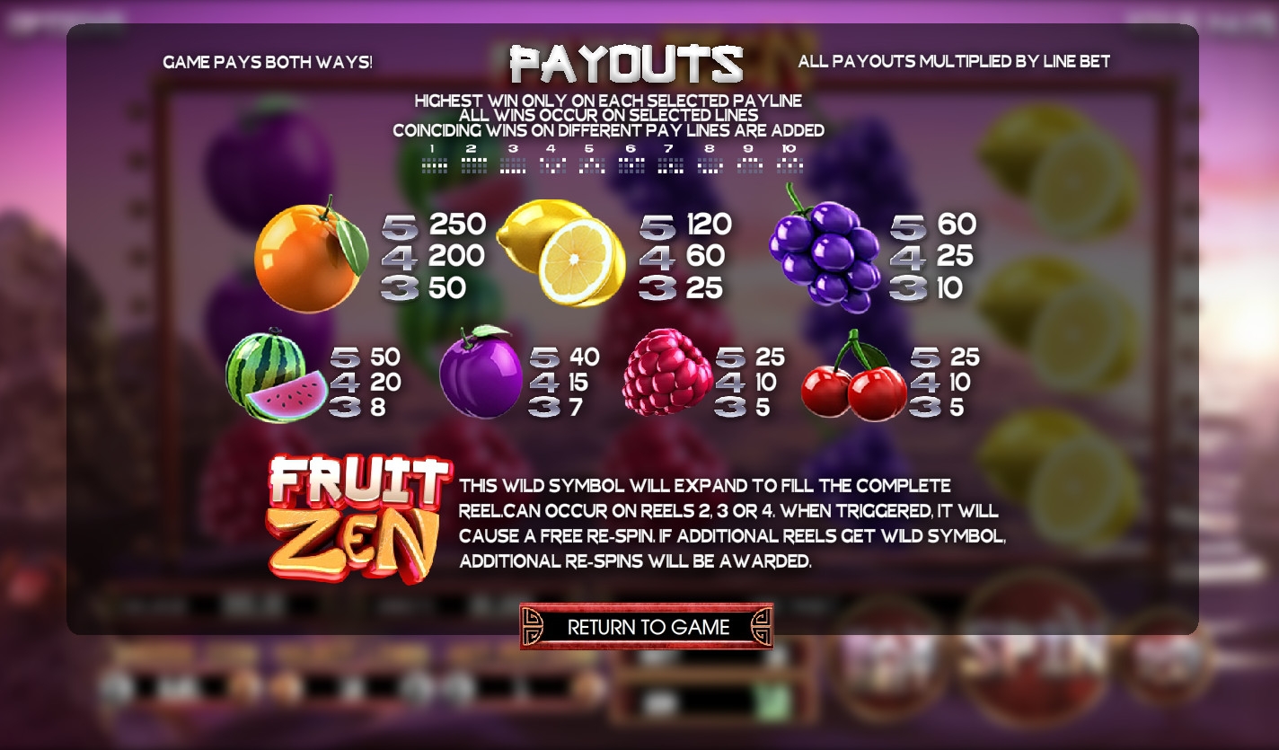 Играть на игровом автомате Fruit Zen можно по одной – десяти активным линиям. На каждую из них можно поставить до десяти монет номиналом 0.01, 0.02, 0.05, 0.10 или 0.50 евро. Максимальная ставка на спин достигает пятидесяти евро.