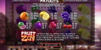 Апельсины, лимоны, сливы, арбузы и другие ягоды и фрукты нарисованы на виртуальных барабанах видео-слота. Специальный символы лишь один – Wild (логотип Fruit Zen). Он появляется на трех средних барабанах. Выпадая, он расширяется на три позиции по вертикали. После этого Wild остается на прежнем месте, а остальные барабаны еще раз вращаются бесплатно. Если выпадает еще один такой символ, он также запускает повторный спин.