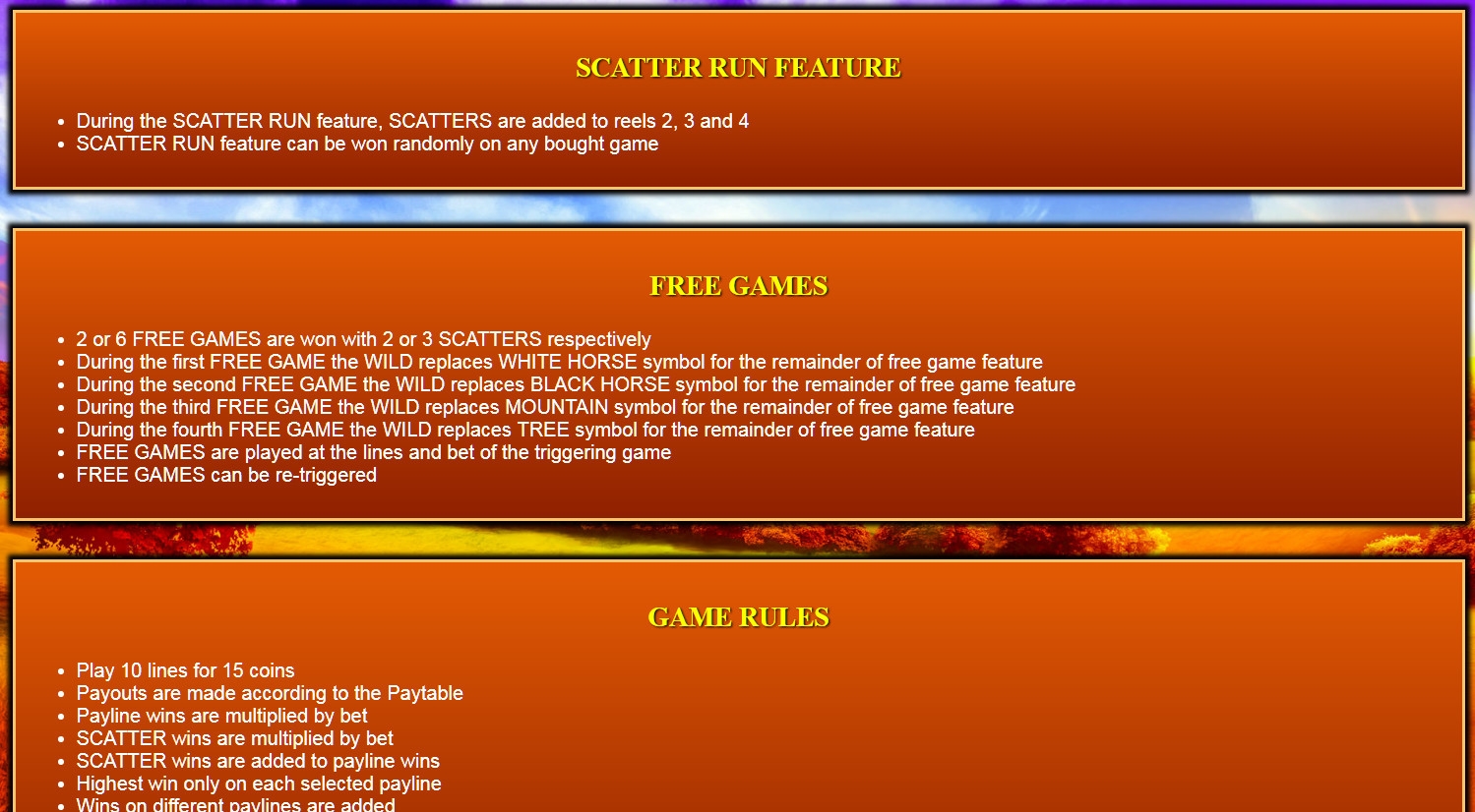 - Free Games – Два или три Scatter начинают два или шесть призовых запусков соответственно. Игра ведется на деньги казино по последней ставке. В первом спине вместо белой лошади в колонках появляются джокеры. Во втором он заменяет также черного коня, в третьем – горы, а в четвертом деревья. Эти Wild остаются в игре до конца фри-спинов.