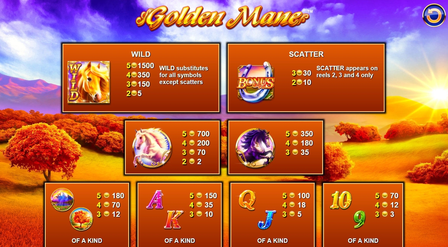 - Wild (золотогривый конь) появляется во всех колонках. Он формирует комбинации даже из двух символов. Также он выступает в качестве джокера, заменяющего прочие изображения.
