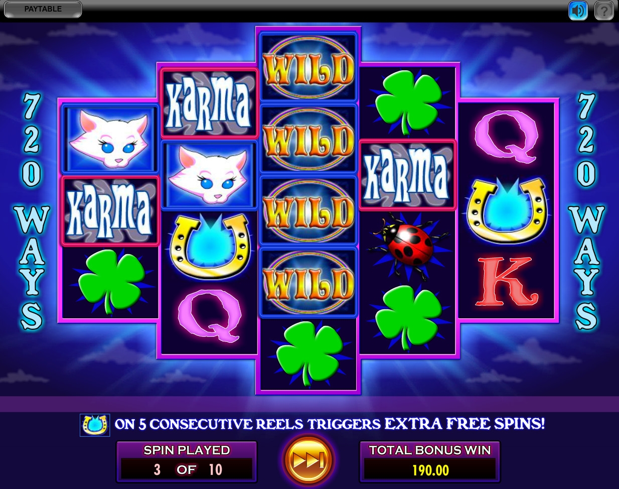 Во время бесплатных спинов на экране появляется альтернативный набор символов. Кот становится белым, 13 превращается в 7, а вместо ворона и зеркала возникают божья коровка и четырехлистный клевер. На скаттере также меняется надпись – KARMA.