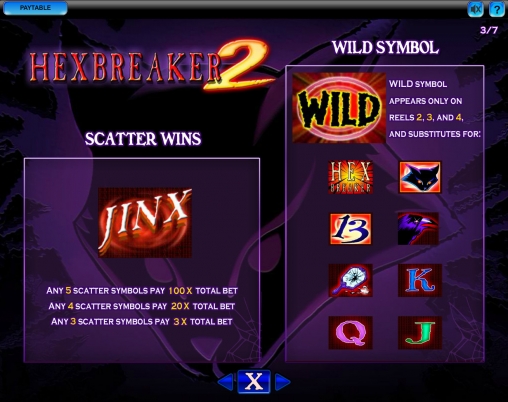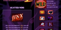 • Scatter (надпись JINX) формирует комбинации независимо от расположения на экране. Три, четыре или пять подобных символов дают выплату в размере трех, двадцати или ста общих ставок соответственно.