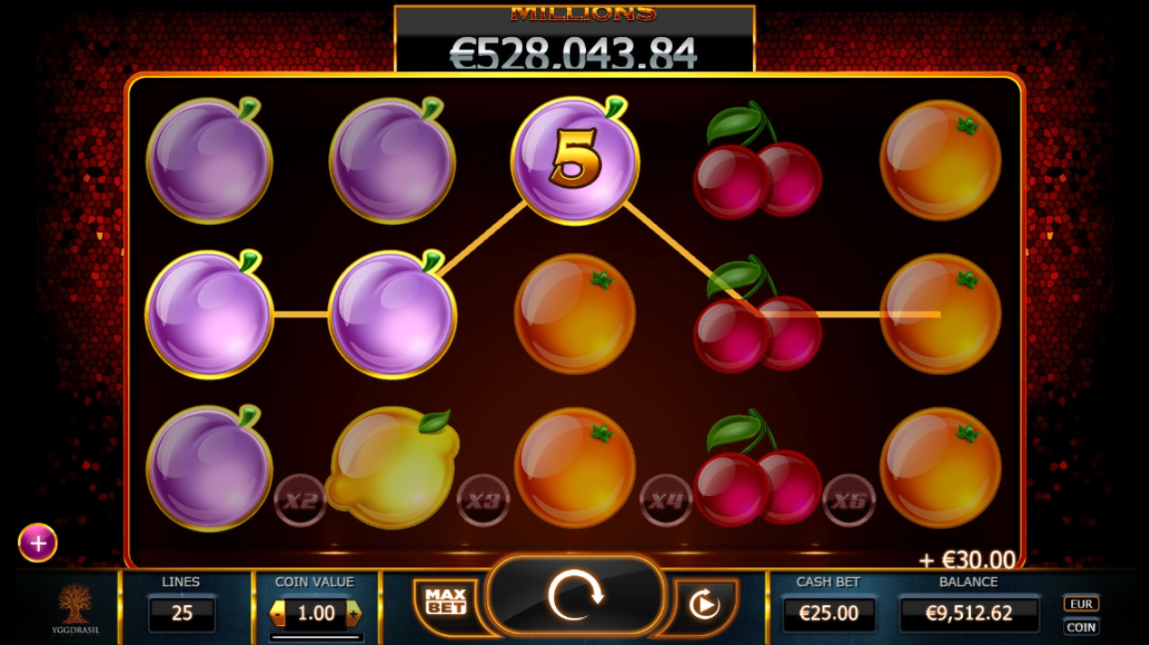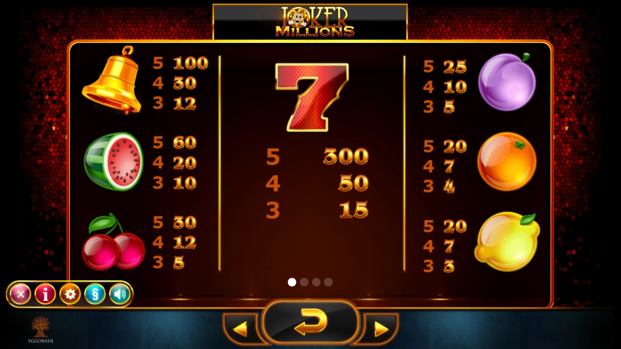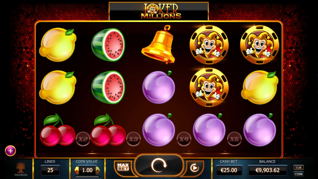 Joker Millions представляет собой игровой аппарат с пятью барабанами, двадцатью пятью постоянно задействованными полосами, на которых образуются оплачиваемые цепочки, и пятнадцатью картинками на основном экране.