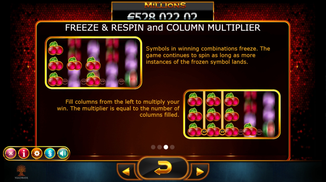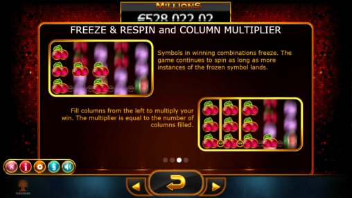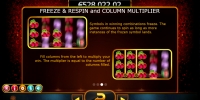 При образовании даже одной последовательности составляющие ее картинки остаются на своих местах, а остальные символы на экране сменяются в результате бесплатного вращения барабанов. Эта опция называется Freeze and Respin. Если формируются новые цепочки, процесс запускается заново. При заполнении одинаковыми элементами целых колонок, начиная с крайней слева, все выигрыши умножаются на дополнительные множители.