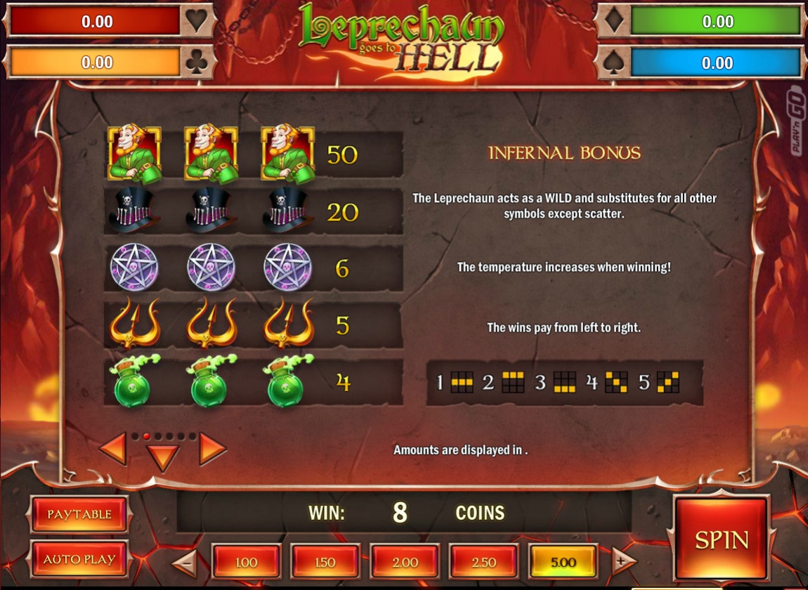 В Leprechaun Goes to Hell разыгрываются четыре прогрессивных джекпота, обозначенные карточными мастями. Каждый выигрыш в раунде Infernal Bonus повышает температуру, что отмечается на специальном термометре. Если отметка достигает определенного уровня, вы получаете соответствующий джекпот. Чем крупнее ставка, тем выше вероятность победы.