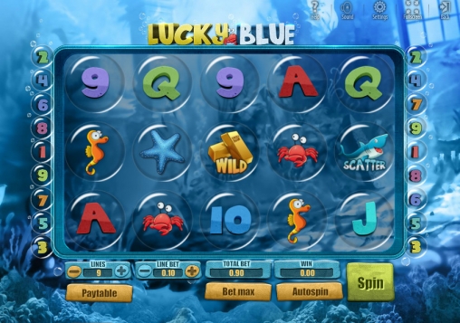 Действие видео-слота Lucky Blue разворачивается на морском дне. Подводный пейзаж служит фоном, на котором вращаются барабаны. На них изображены обитатели океанской фауны, якорь, а также буквы и цифры, обозначающие номиналы карт от девятки до туза.