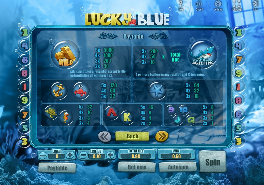 «Счастливый океан» - это 5-барабанный слот с картинками на экране в три ряда. Пользователи могут играть на игровом автомате не более чем по девяти активным линиям (схема их расположения есть в правилах), сделав на них равные ставки одного из следующих размеров: 0.10, 0.25, 0.50, 0.75 или 1 кредит. Можно легко подсчитать, что на спин ставится не более девяти кредитов.
