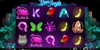 Неоновые Джунгли очень красивый и красочный игровой слот имеет стандартный набор пять барабанов двадцать линий есть так же бонусная игра и в целом бонусная линия очень щедрая.