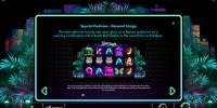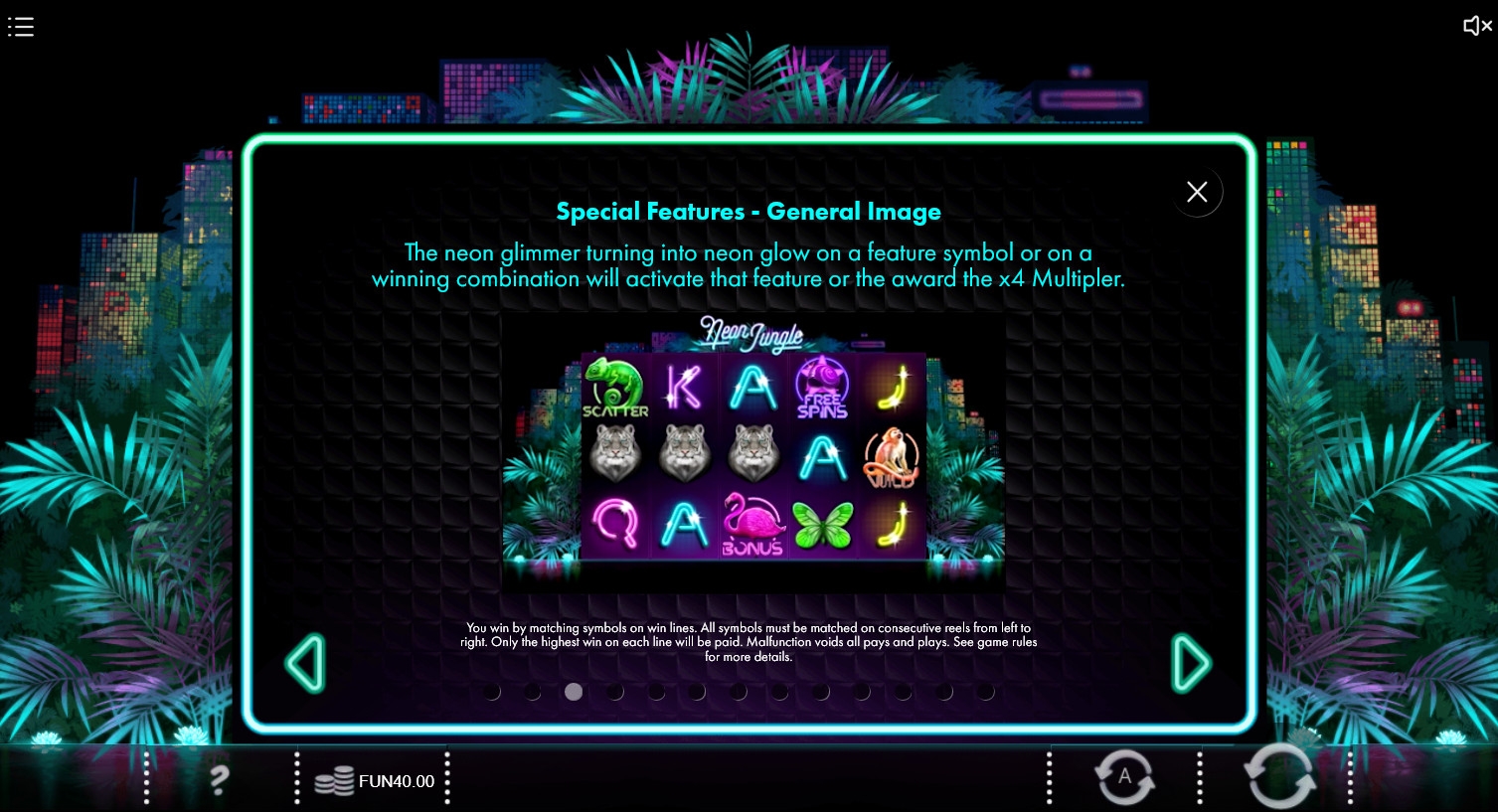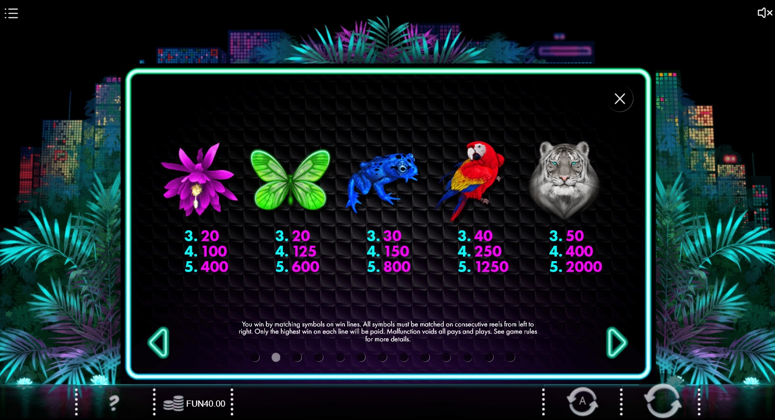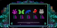 В игровом автомате Neon Jungle пять барабанов, три ряда картинок и двадцать постоянно используемых линий.