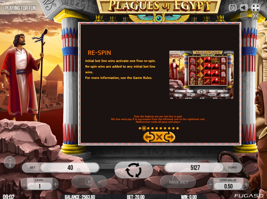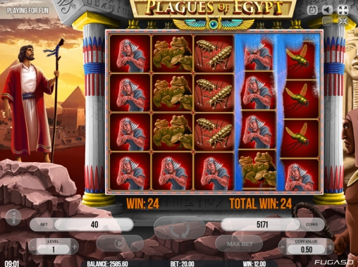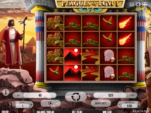 Компания Fugaso обратилась к одной из самых жутких библейских историй – десяти египетским казням. Напомним, что речь идет о страшных бедствиях, которые постигли египтян после того, как фараон не захотел отпустить на волю порабощенных израильтян во главе с Моисеем. Ужасным событиям древности посвящен игровой автомат Plagues of Egypt.