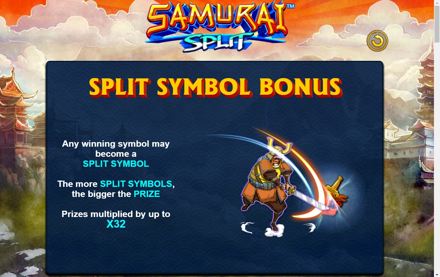 В игровом аппарате Samurai Split представлены базовые картинки, джокеры, скаттеры, бонусы Split Symbol и Warrior Spin, а также призовые вращения с дополнительными возможностями.