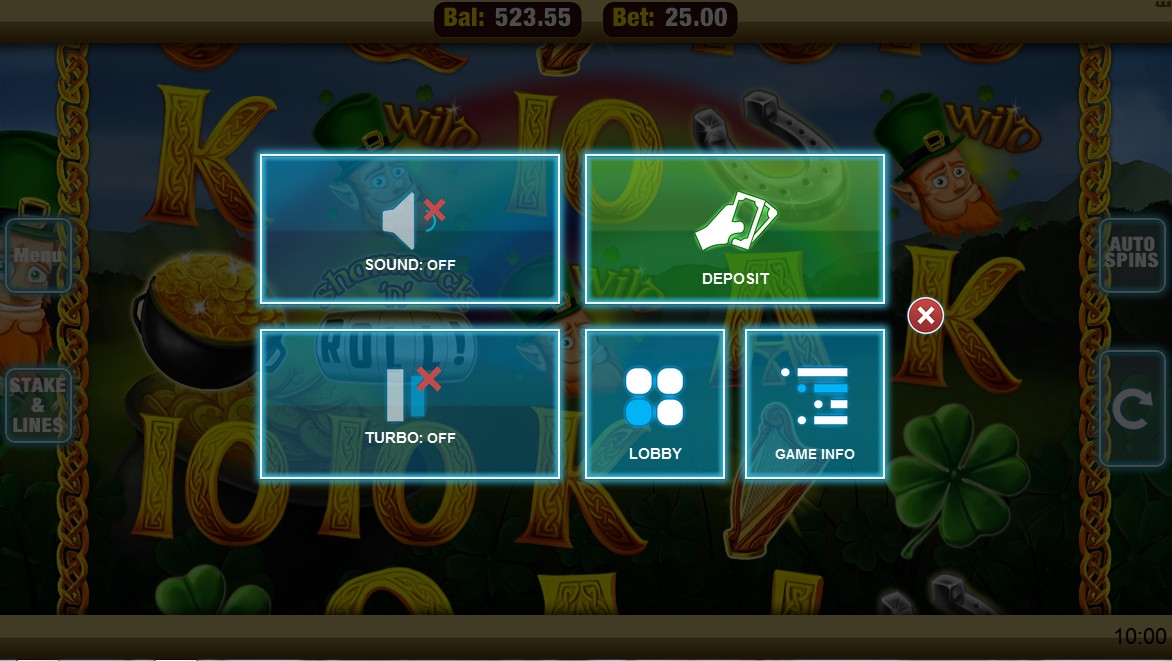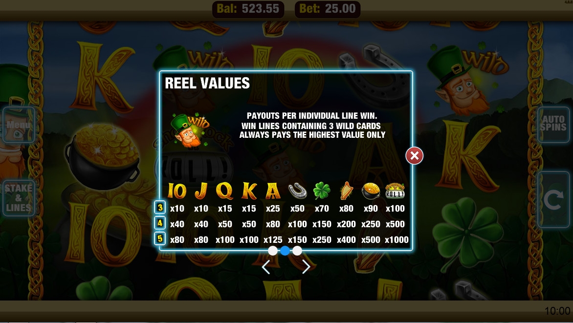 Shamrock ‘n’ Roll имеет пять барабанов и двадцать пять линий. Количество полос необязательно должно быть максимальным. Игрок может задействовать от 1 до 25 линий, сделав по ним равные ставки в диапазоне от 0.01. до 1 евро. Выходит, что на спин можно ставить даже один цент, а максимальная сумма – двадцать пять евро.