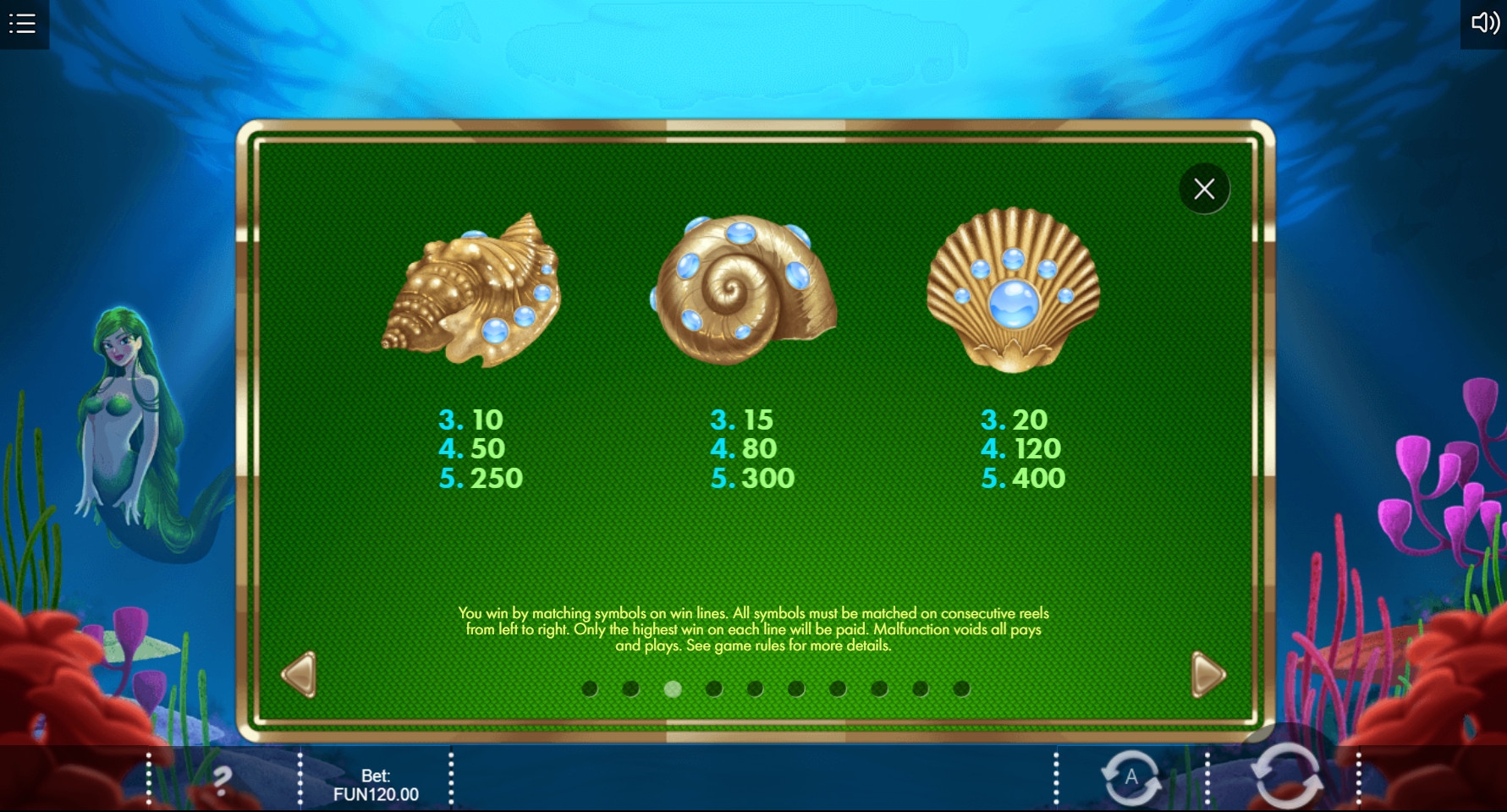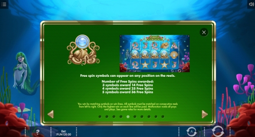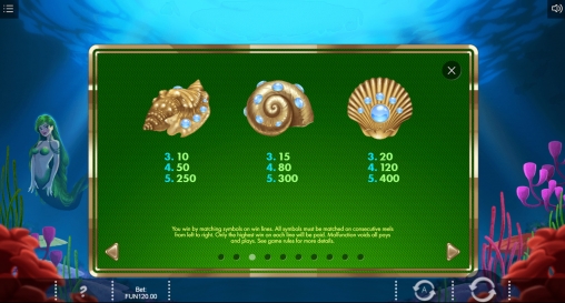 В игровом автомате «Царство сирены» пять барабанов и три ряда иконок на главном экране. Активных линий всегда тридцать. На каждую можно ставить от одного цента до пяти долларов (0.30 – 150 долларов на спин).