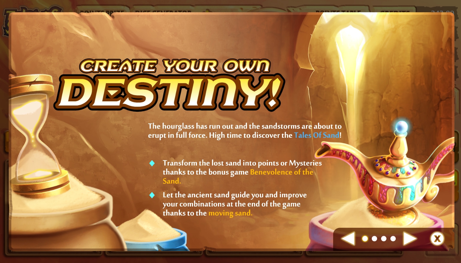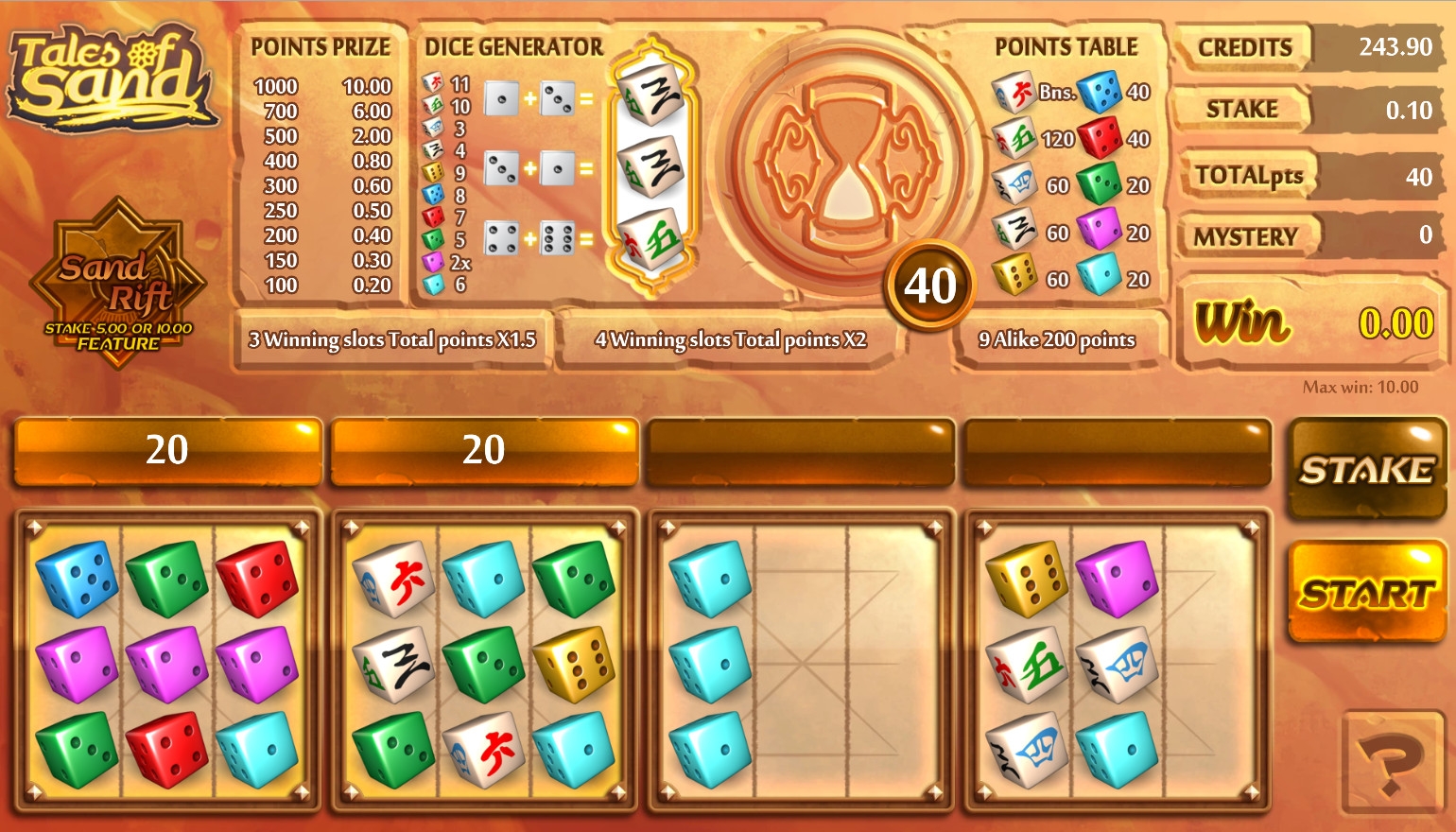 Цель игры в Tales of Sand заключается в том, чтобы получать выплаты за комбинации, собранные из одинаковых граней игральных костей.
