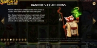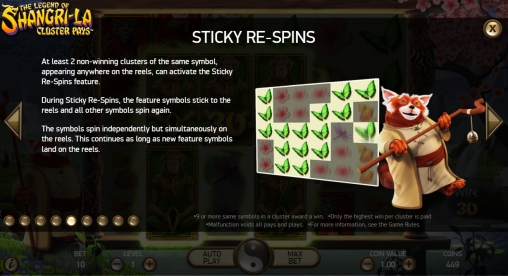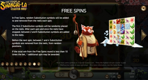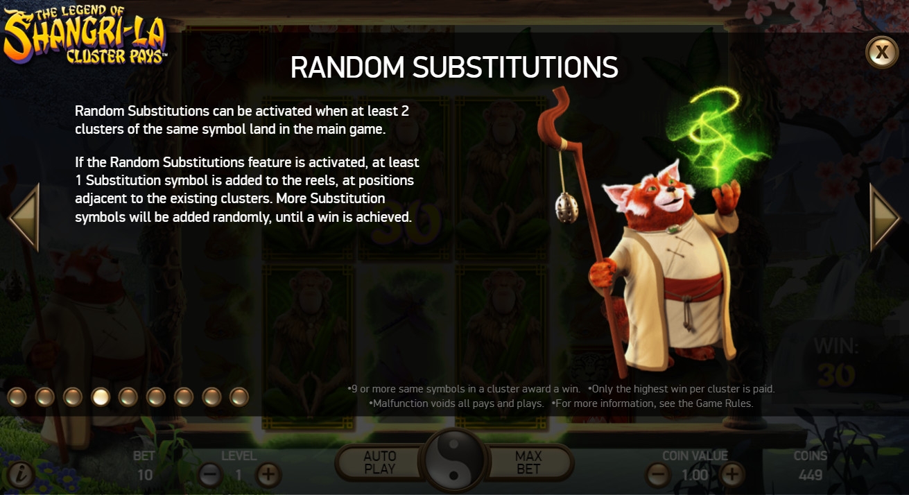 • Random Substitution – Слева от барабанов находится красная панда с посохом. Если на поле есть минимум два кластера, она превращает один или несколько других символов в джокеры.