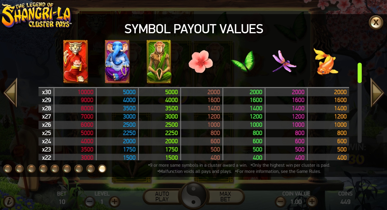 «Легенда Шангри-Ла» - это видео-слот с шестью барабанами и тридцатью (6х5) картинками на экране.