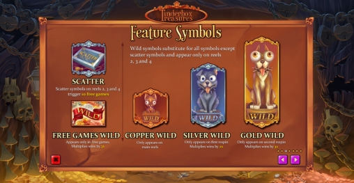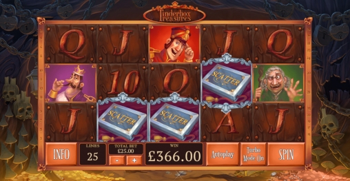 Игровой автомат Tinderbox Treasures, посвященный сказке «Огниво» . поэтому интерфейс и символы оформлены в сказочной тематике.Огромное колличество бонусов в игре,бесплатные спины (вращения) ,бонусная игра и многое другое.Процент выплат 96% а мин. ставка всего 1 цент.