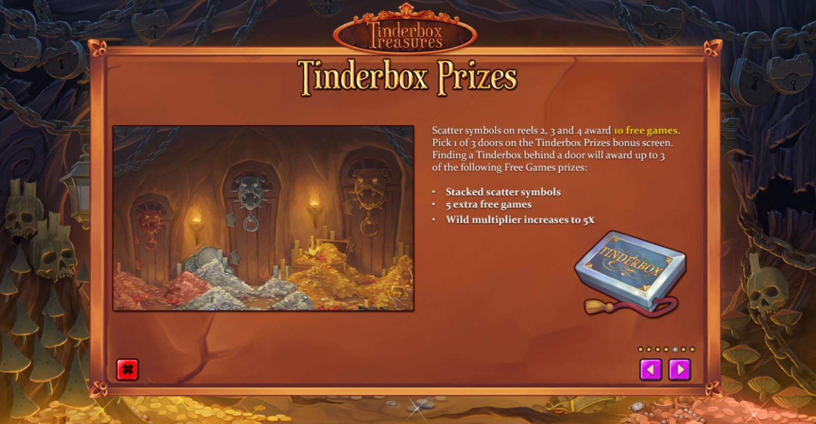 - Tinderbox Prizes – Бесплатным спинам предшествует розыгрыш дополнительных призов. На экране появляются три двери. Нужно выбрать одну из них. Если вам удастся найти коробочку с огнивом, вас ждет подарок: еще пять фри-спинов, стекированные скаттеры или множитель джокеров х5.