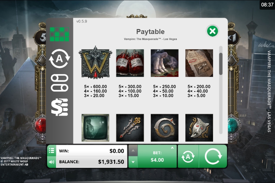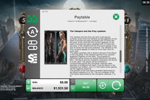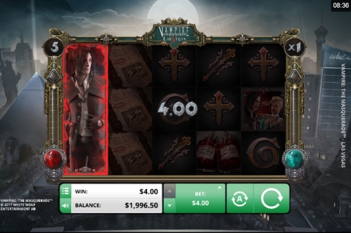 На экране видео-слота появляются вампиры, другие персонажи Vampire: The Masquerade и всевозможные значки, используемые в настольной игре.