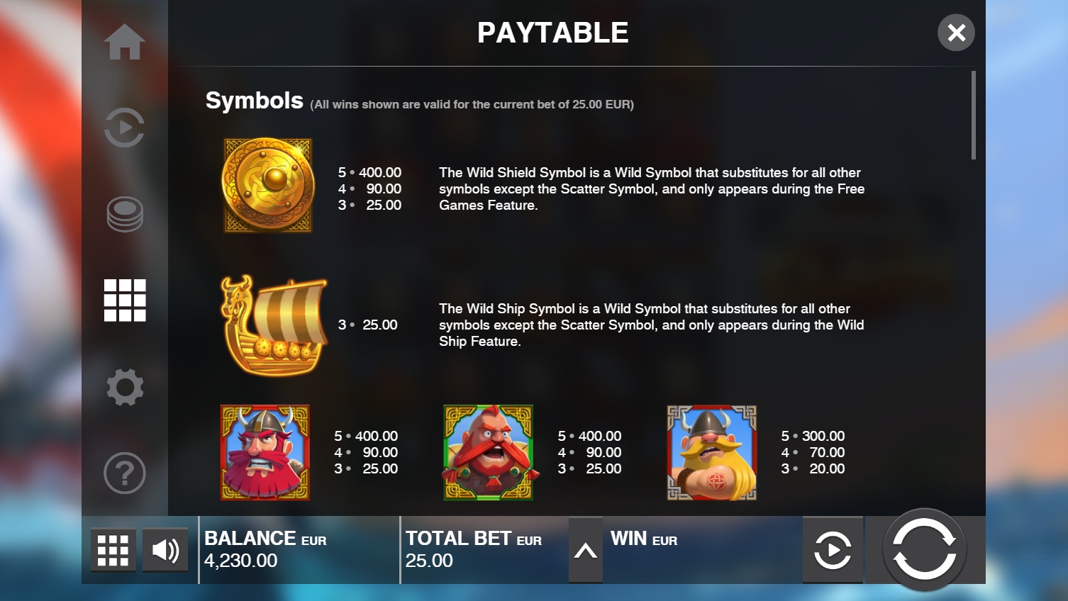 Раунда на удвоение нет. Об исключениях из правил, особых картинках и бонусах читайте ниже в обзоре Viking Clash.