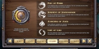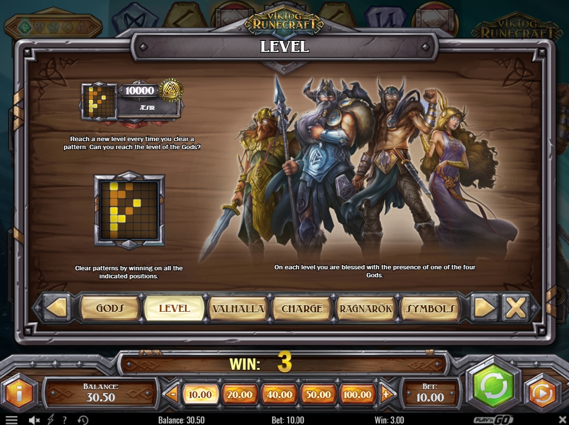 • Levels – При запуске модели вы увидите, что на подложке, под картинками на экране, несколько ячеек выделены цветом. Они составляют определенный шаблон. Когда в таком месте оказывается картинка из выигрышной цепочки, цвет ячейки меняются. Чтобы перейти на следующий этап, нужно подобным образом активировать все позиции. На каждом уровне игроку благоволит один из четырех скандинавских богов. Он периодически задействует бонусы.