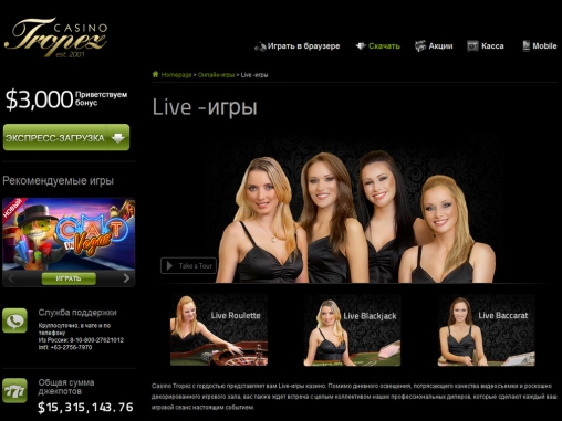 В целом казино «Тропез» давно зарекомендовало себя как очень серьезный и авторитетный сайт с отменным выбором игр и массой выгодных предложений. Раздел с живыми дилерами также выдержан на исключительно высоком уровне. Вы сами в этом убедитесь, когда протестируете данные модели.