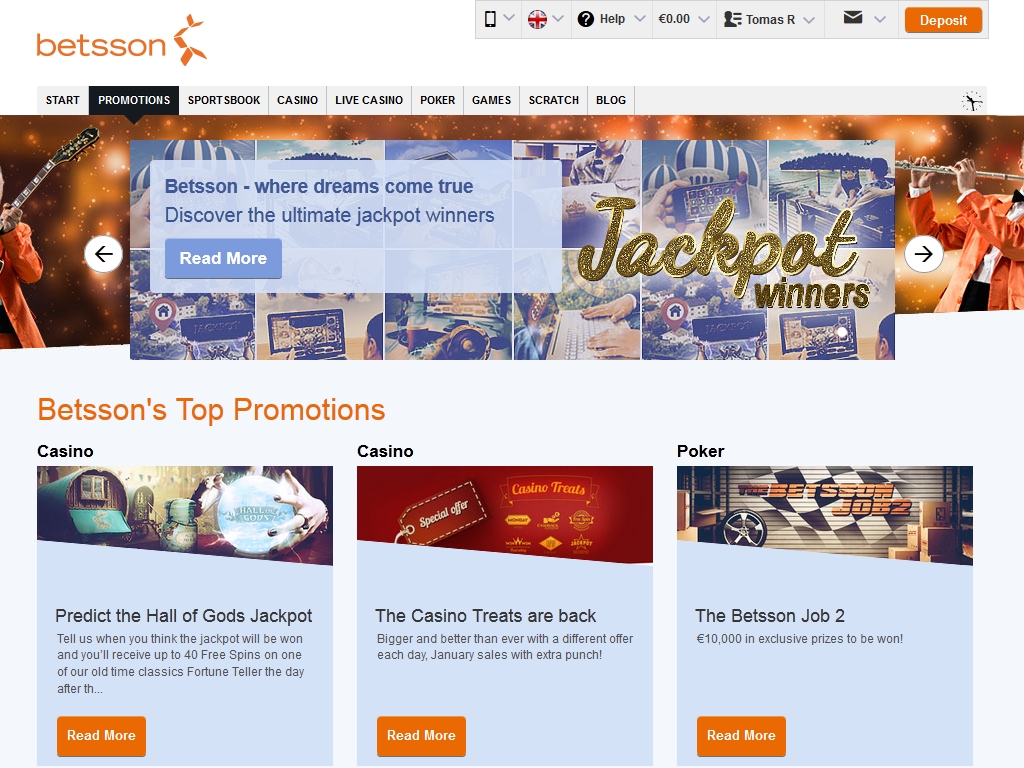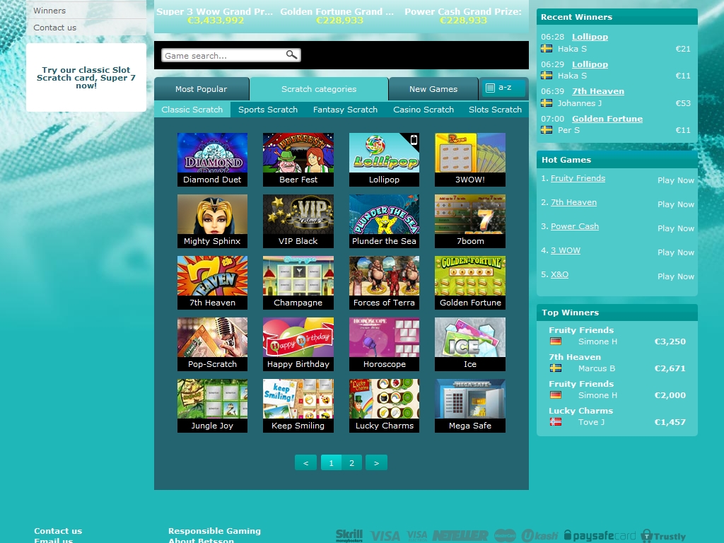Раздел Betsson Scratch портала Betsson выполнен в бело-голубых тонах. Такая расцветка могла бы показаться бледноватой, если бы не многочисленные яркие баннеры, логотипы и прочие элементы дизайна, которые делают его более живым и оригинальным.