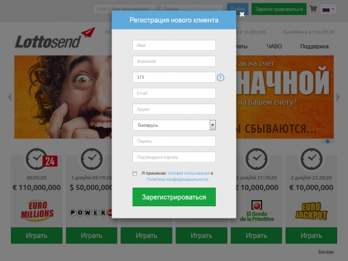 На сайте Lottosend наши обозреватели не нашли информации о каких-либо акциях и бонусах для клиентов.