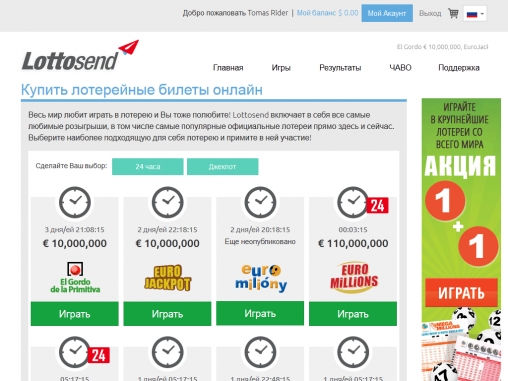 Услуги, которые предлагает Lottosend, наверняка будут полезны многим читателям нашего портала. Данное заведение поможет принять участие в лотереях, которые иначе оставались бы недоступными игрокам, проживающим за пределами стран, где устраиваются эти розыгрыши. Очевидными достоинствами сайта являются удобный интерфейс, разнообразие предложений, полный перевод на русский язык и поддержка различных платежных систем.