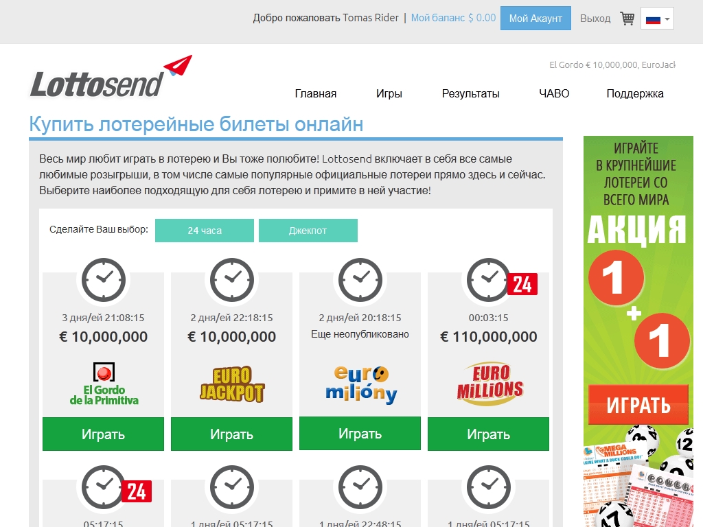 Лотереи Пользуясь услугами Lottosend, можно участвовать в крупных лотереях, в числе которых EuroJackpot, EuroMillions, Euromiliony, MegaMillions, SuperEnalotto, PowerBall и SuperLotto Plus.