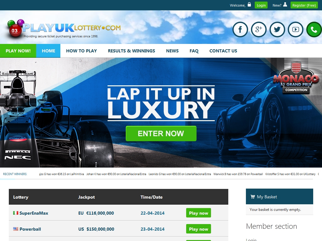 Лотереи Пользователи, зарегистрировавшиеся в Play UK Lottery, могут приобретать билеты на розыгрыши всех самых крупных лотерей в мире, включая EuroMillions, MegaMillions, USA PowerBall, SuperEna Max, UK Lottery, SuperEnaLotto, EuroJackpot, Oz Lotto, Oz Powerball, France Lotto, Mega-Sena, SuperLotto Plus, El Nino Raffle, El Gordo, La Primitiva, El Gordo De Navidad и другие.