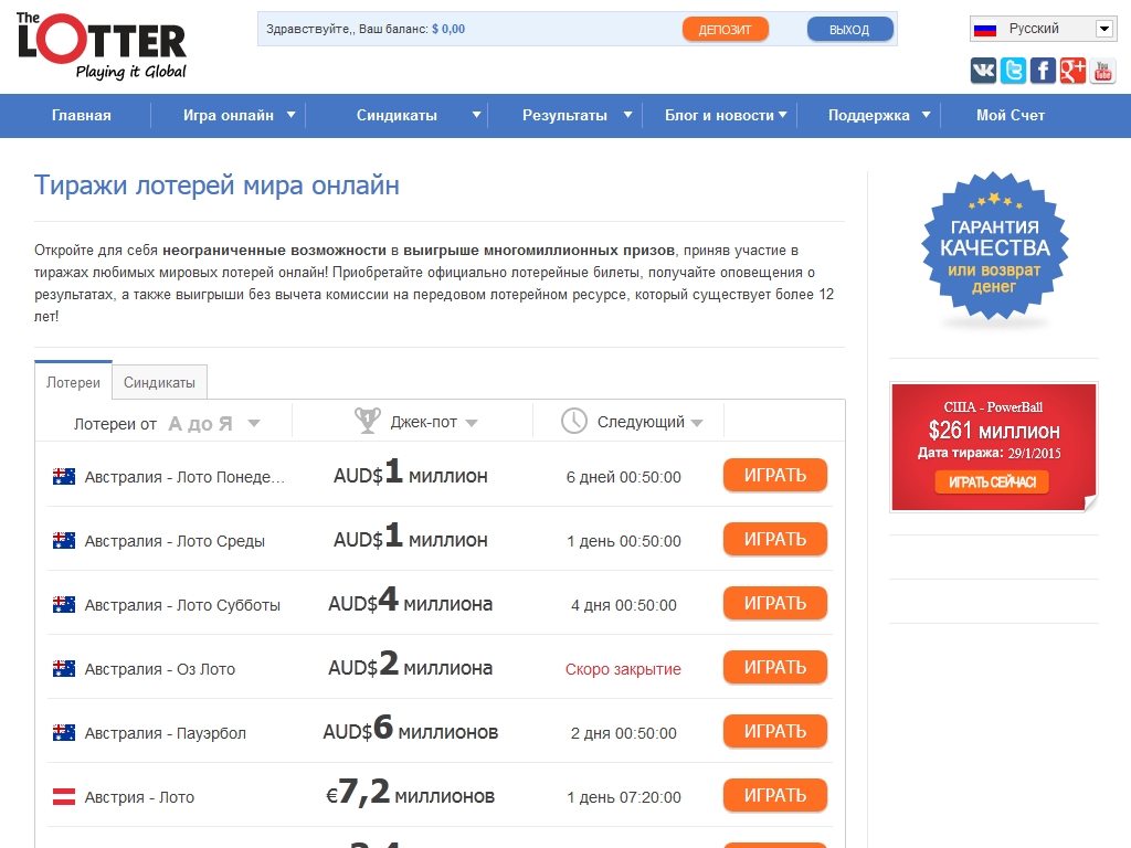 Сайт The Lotter предлагается на десяти языках, включая полную версию на русском. Но имейте в виду, что официальная версия пользовательского соглашения и правил представлена на английском языке, поэтому ориентироваться следует на нее. На сайте также можно найти массу полезной информации о текущих и будущих розыгрышах, победителях лотерей, услугах ресурса и многом другом.