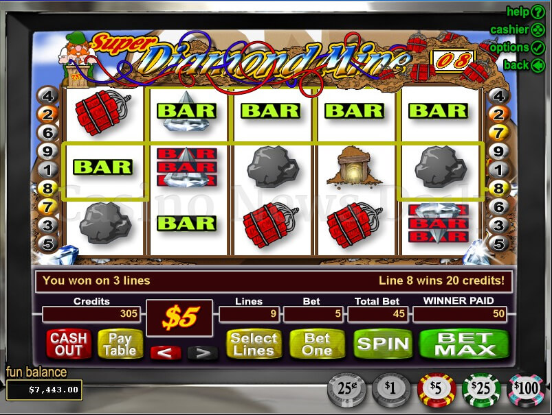 В этом пяти барабанном слоте с девятью линиями предусмотрено множество бонусов и развлекательных игр, в том числе бонусы Super Diamond Mine, Cascading Diamonds и щедрые прогрессивные джекпоты. Казино также предлагает игрокам вступительный бонус в размере 600 долларов.