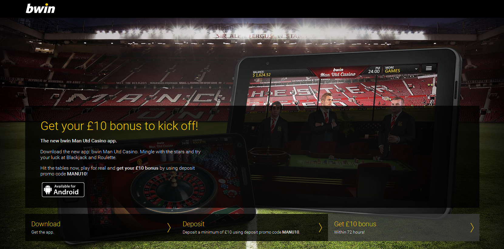 На данный момент приложение доступно для загрузки на Android через сайт bwin.com/manutdcasino и только для жителей Великобритании. Первое время игроки будут получать 10 фунтов в качестве бонуса, если внесут депозит в 10 фунтов и используют код MANU10.
