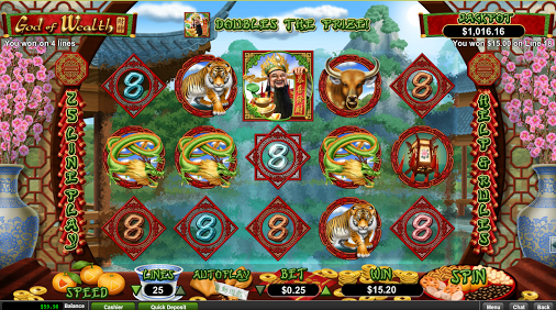 Китайский Бог процветания Caishen является основным элементом игрового слота God of Wealth. Он демонстрирует вам свою щедрость на протяжении всей игры, раздавая огромное количество бесплатных спинов, выплат золотых слитков, множество выигрышей с символом wild и если повезет, прогрессивный джекпот God of Wealth. Количество линий выплат можно отрегулировать от 1 до 25. Ставки варьируются от 10 центов до 1 доллара за линию, что предоставляет игроку больше времени для того, чтобы сорвать банк.