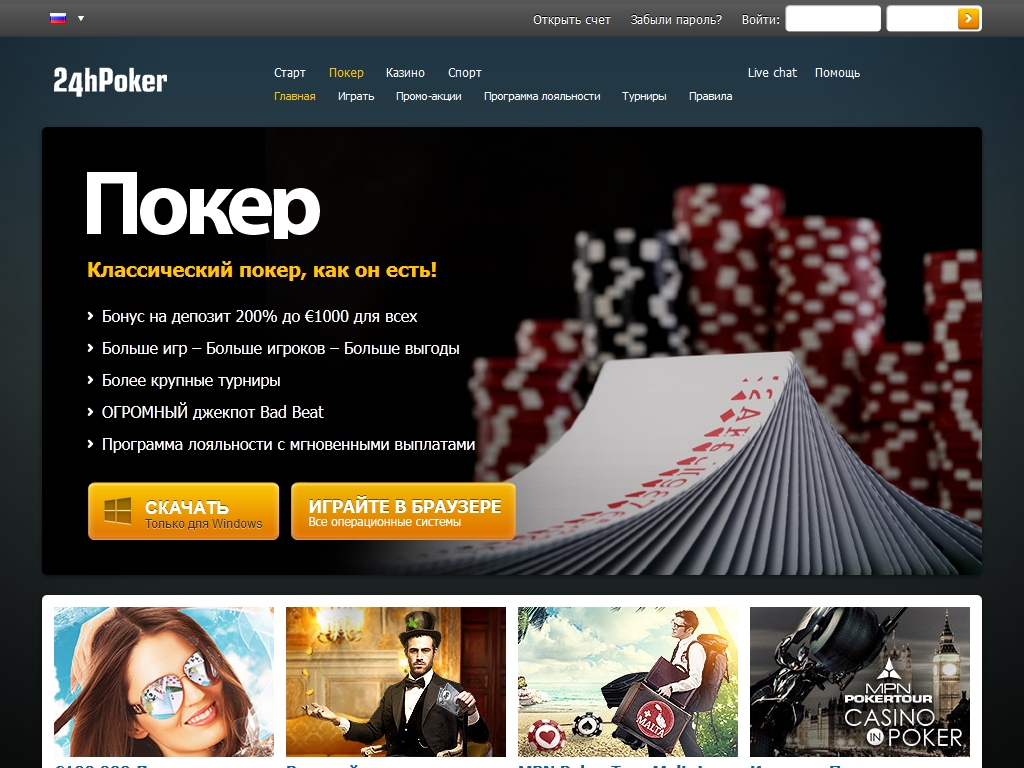 24hPoker был основан в 2001 году, и на данный момент является одним из популярным покер-румом известной игровой сети Microgaming. 24hPoker предлагает всем посетителям игровой площадки увлекательное онлайн-казино, где постоянно разыгрывается Джек-пот, превышающий $1000000, букмекерскую контору, в которой можно сделать ставки на всевозможные спортивные состязания, а также покер-рум. На покер-руме представлены все популярные разновидности покера, это техасский холдем, Омаха, стад и разз. 24hPoker предлагает новым игрокам, прежде чем начать играть, пройти обучение в школе покера, а при необходимости повысить уже имеющиеся навыки. На покер-руме достаточно много столов для игры на наличные деньги и проводится множество турниров с разными байнами и структурой. Постоянные игроки могут участвовать в различных акциях и получать крупные денежные призы, а также пройти квалификацию в сателлитах и выиграть билет на один из популярных покерных турниров. Также на покер-руме часто проводятся сателлиты с розыгрышем призовых пакетов на живые турниры, проходящие в самых известных казино мира.