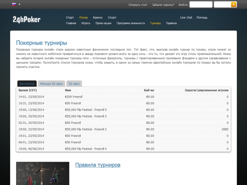 На 24hPoker проходит не мало турниров, это ежедневные фрироллы для новичков, СНГ-турниры для любителей не больших турниров, а также МТТ-турниры с гарантированными призами.