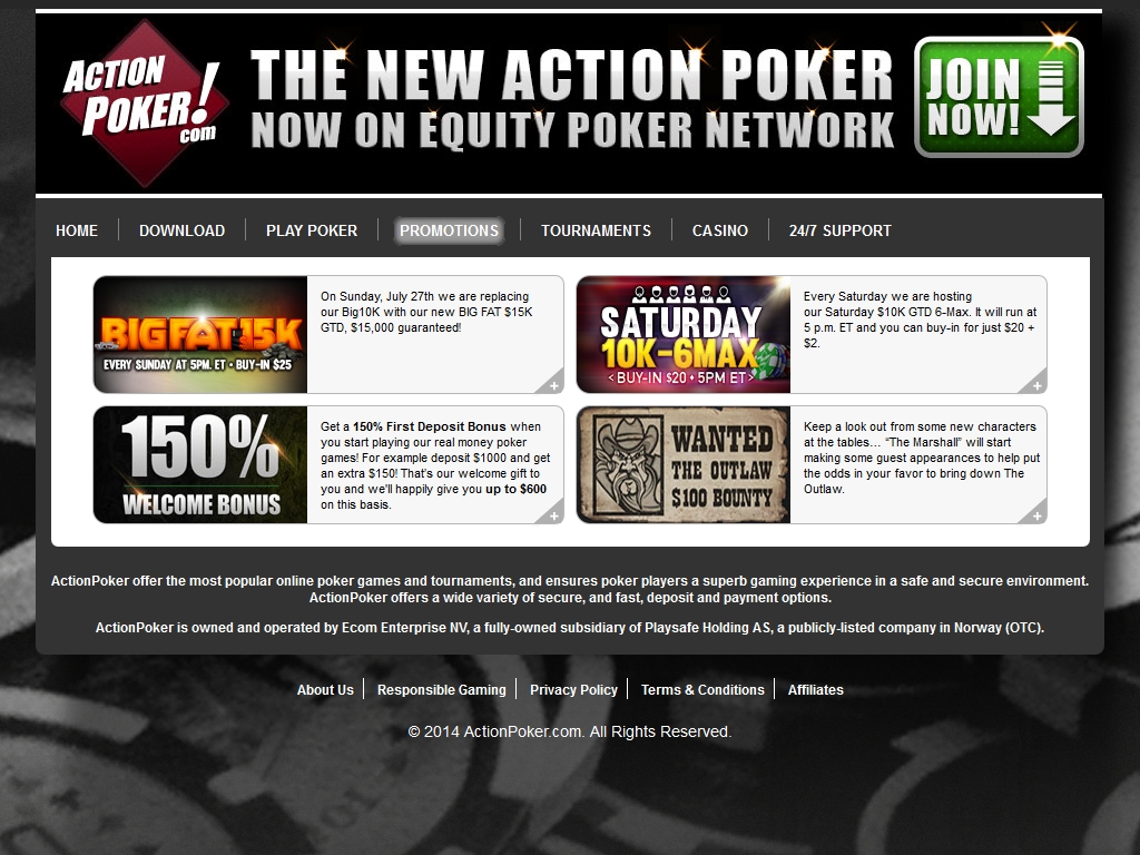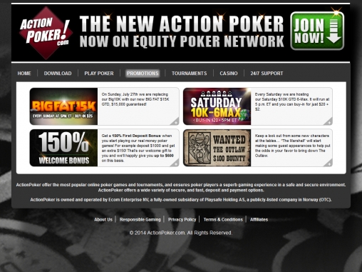 Actionpoker был создан в 1999 году и является основной покерной комнатой игровой сети ActionPoker Network. Данная игровая сеть одна из первых стала предоставлять азартным игрокам игры в покер онлайн. Актион Покер является собственностью компании Ecom Enterprise NV, которая входит в норвежскую группу компаний Playsafe Holding AS.