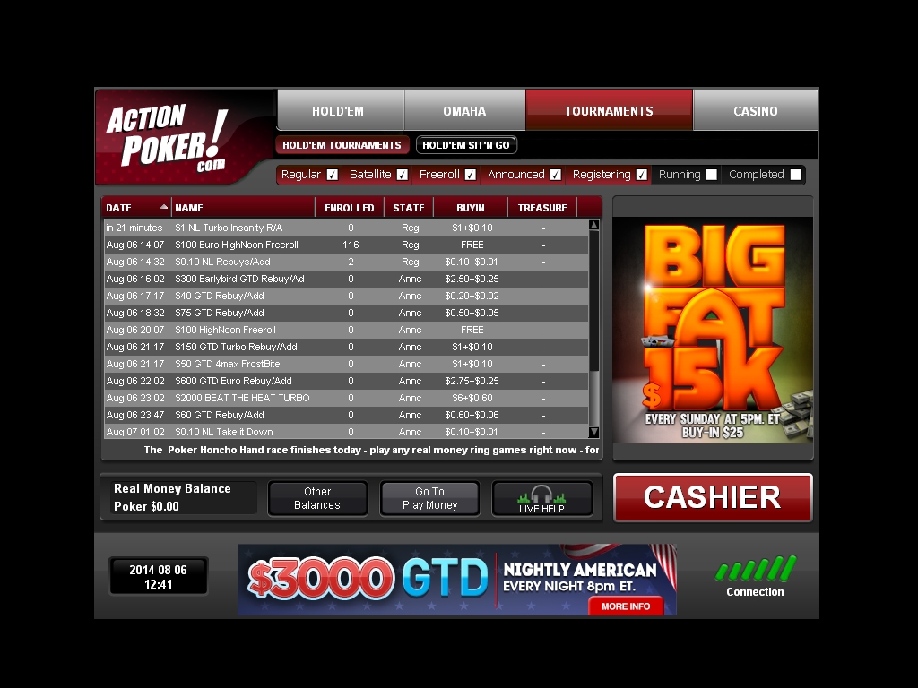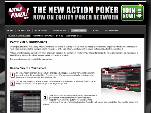 Actionpoker проводит в своей комнате большое количество разнообразных турниров, различающихся байнами и структурой игры.