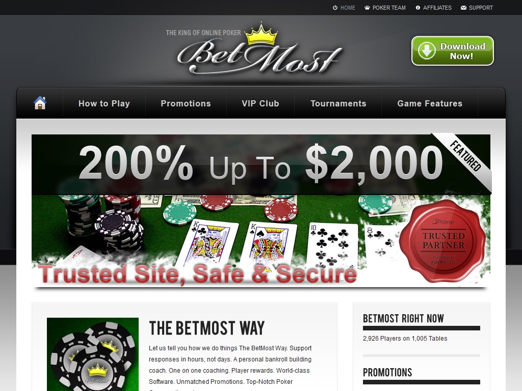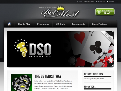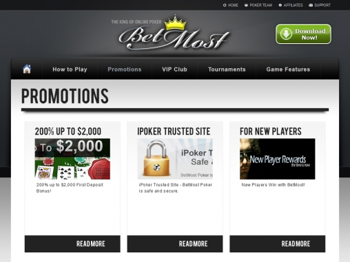BetMost Poker является собственностью компании WHG Trading Limited. Покерная комната предоставляет возможность пользователям играть в наиболее популярные разновидности покера, но особый акцент сделан техасский холдем. На игровой площадке нельзя играть гражданам Соединенных Штатов Америки, Израиля, Гонконга и Болгарии, любители азарта из других стран мира могут без проблем зарегистрироваться в покер-руме и воспользоваться щедрыми предложениями. Новые игроки могут без труда получить бонус на первый депозит, который по максимуму равняется 2000 долларов. Кроме этого все игрокам предлагается принять участие в разнообразных акциях, в которых призовые фонды зачастую превышают несколько сот тысяч долларов, а особой популярностью пользуются многочисленные сателлиты, позволяющие выиграть путевки для поездки на популярные покерные серии.