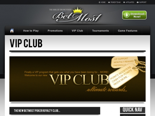 VIP Club BetMost – это программа лояльности, созданная для активных игроков покер-рума. Клуб имеет десять уровней, соответственно, чем выше уровень, тем больше очков зарабатывает игрок, а их в дальнейшем можно обменивать на денежные средства и турнирные билеты. Также клуб предлагает бесплатно игрокам в зависимости от уровня билеты на турниры с призовыми фондами: $250, $500, $1000 и $5000.
