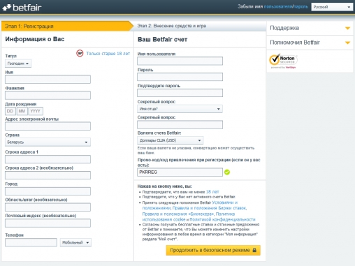 Регистрация в Betfair