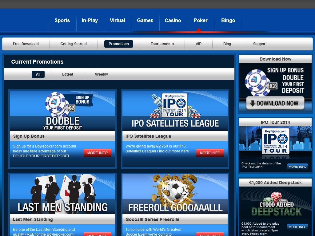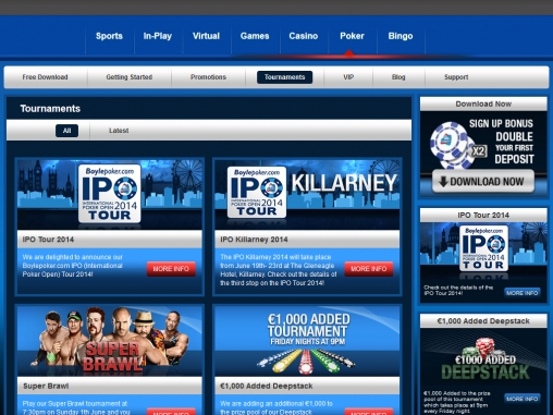Надо сказать, что владельцы Boylepoker управляют самыми крупными живыми соревнованиями по покеру в Европе, одним из них является The International Poker Open, на который можно попасть через покер-рум, выиграв призовой пакет в одном из сателлитов. The International Poker Open проходит ежегодно в городе Дублине, и попасть на него стремятся не только игроки-любители, но и многие профессионалы.