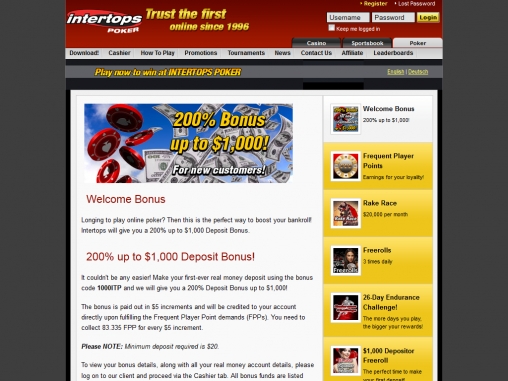 ИнтерТопс Покер приветствует всех новых игроков внушительным бонусом в 200% и достигает $1000. Чтобы получить этот бонус следует зарегистрироваться на покер-руме и внести на игровой счет от $20 до $1000. Далее необходимо активировать бонус в течение 24 часов, введя промо-код «1000ITP», после этого нужно начать играть на кеш-столах или в турнирах и зарабатывать FPP-очки. За каждые заработанные 83,375 очков игроку будет перечисляться на счет по $5. Если игрок внес на счет меньшую сумму, к примеру, $100 и быстро отыграл положенный бонус, то он может пополнить еще раз счет, чтобы продолжить участие в бонусной программе за депозит, эту процедуру можно повторять неоднократно в течение 90 дней, пока не будет отыгран бонус по максимуму.
