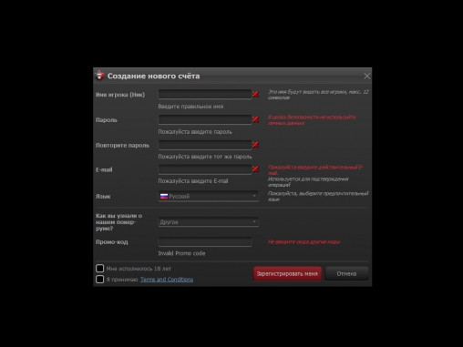 - регистрация в покерной комнате (для новых игроков)