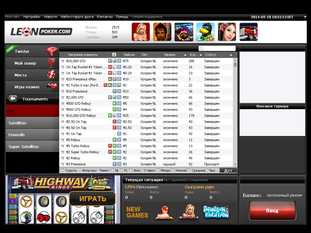 Знаком с букмекерской конторой Леон, видимо, покер-румы модно открывать при конторах. На первый взгляд, все хорошо, неплохие бонусы, поддержка русского языка, множество систем пополнения.